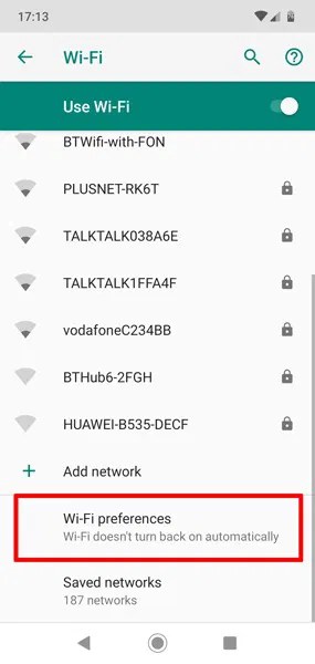 لإيقاف تشغيل هذه الميزة ، انتقل إلى “الإعدادات -> الشبكة والإنترنت -> Wi-Fi -> تفضيلات Wi-Fi” ، حسب السكرين شوت التالي :