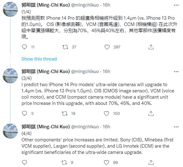 نشر المحلل Ming-Chi Kuo مجموعة من التغريدات توقع من خلالها أن الكاميرا بزاوية واسعة جدًا لجهازي آيفون 14 برو ( iPhone 14 Pro) سيتم ترقيتها إلى 1.4 ميكرومتر، جدير بالذكر أن الكاميرا بزاوية واسعة جدًا لهاتف iPhone 13 Pro تبلغ 1.0 ميكرومتر.