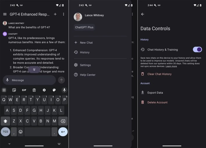 تمامًا مثل موقع الويب وiOS ، يمكن الوصول إلى تطبيق أندرويد لمستخدمي ChatGPT مجانًا ولأولئك الذين لديهم اشتراك ChatGPT Plus مدفوع. يمكن للمشتركين فقط النقر فوق GPT-3.5 أو GPT-4 حسب الوضع الذي تريد استخدامه. ومن أيقونة الهامبرغر ، توجه إلى قائمة الإعدادات حيث يمكنك تصدير محادثاتك إلى ملف HTML قابل للعرض ، ومسح محفوظات الدردشة الخاصة بك ، وحذف حساب ChatGPT الخاص بك.